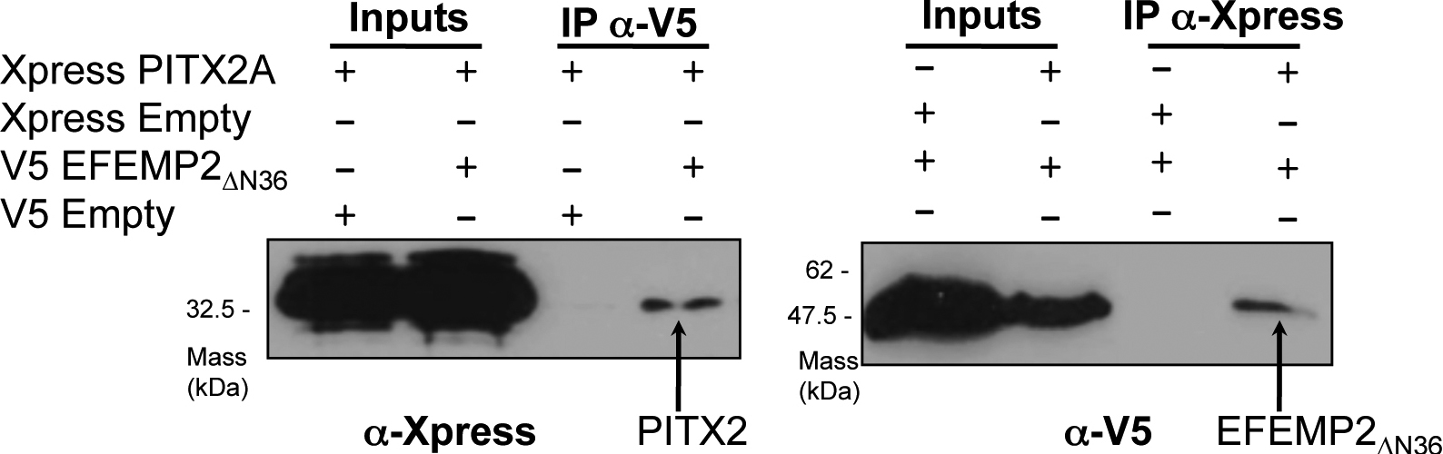 between PITX2 and EFEMP2. Left Panel: The Xpress-PITX2A protein