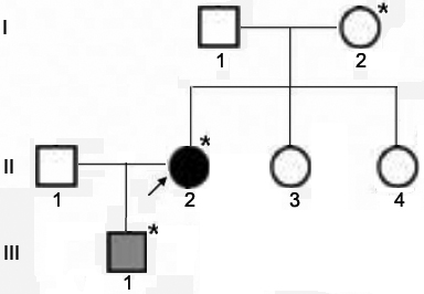 The filled gray square indicates the individual with hematuria. The arrow indicates the proband. The asterisks indicate the
