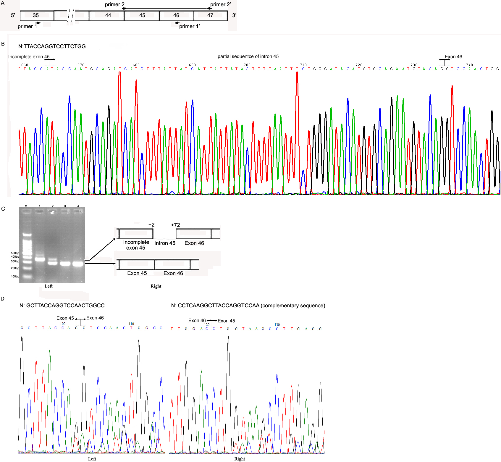 in III-1. The junctions of exons 45, 46, and intron 45 are shown