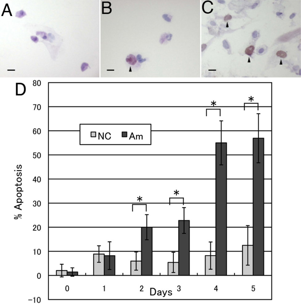 with Acanthamoebae. TUNEL-positive cells are not detected in cultures of fibroblasts without Acanthamoebae (A). Arrowheads show TUNEL-positive apoptotic corneal fibroblasts cultured with Acanthamoebae (B) and with Actinomysin D (C). Scale bar=100 µm. D: Percentage of Annexin V-positive cells. A significant increase of Annexin V-positive corneal fibroblasts was detected on