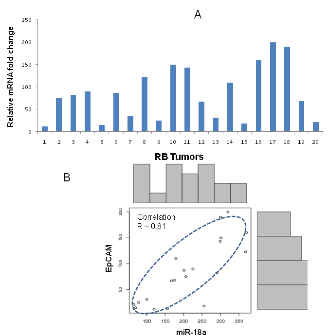 200 fold compared to normal control retina samples. B: The plot showing the correlation between EpCAM and miR-18a in primary RB tumors. The correlation R value is equal to 0.81