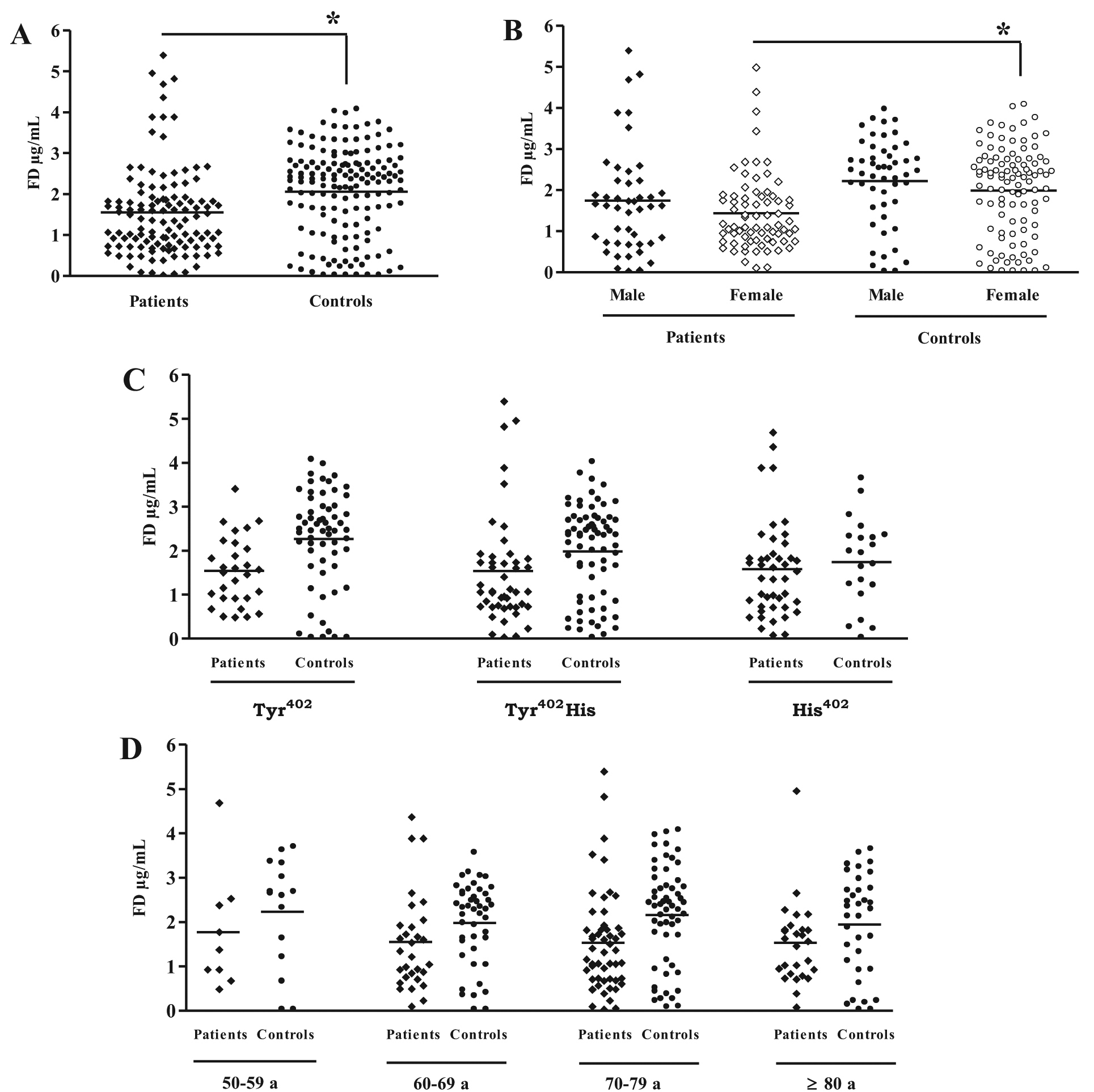 (FH) polymorphism (C) and age (D). *p<0.05.