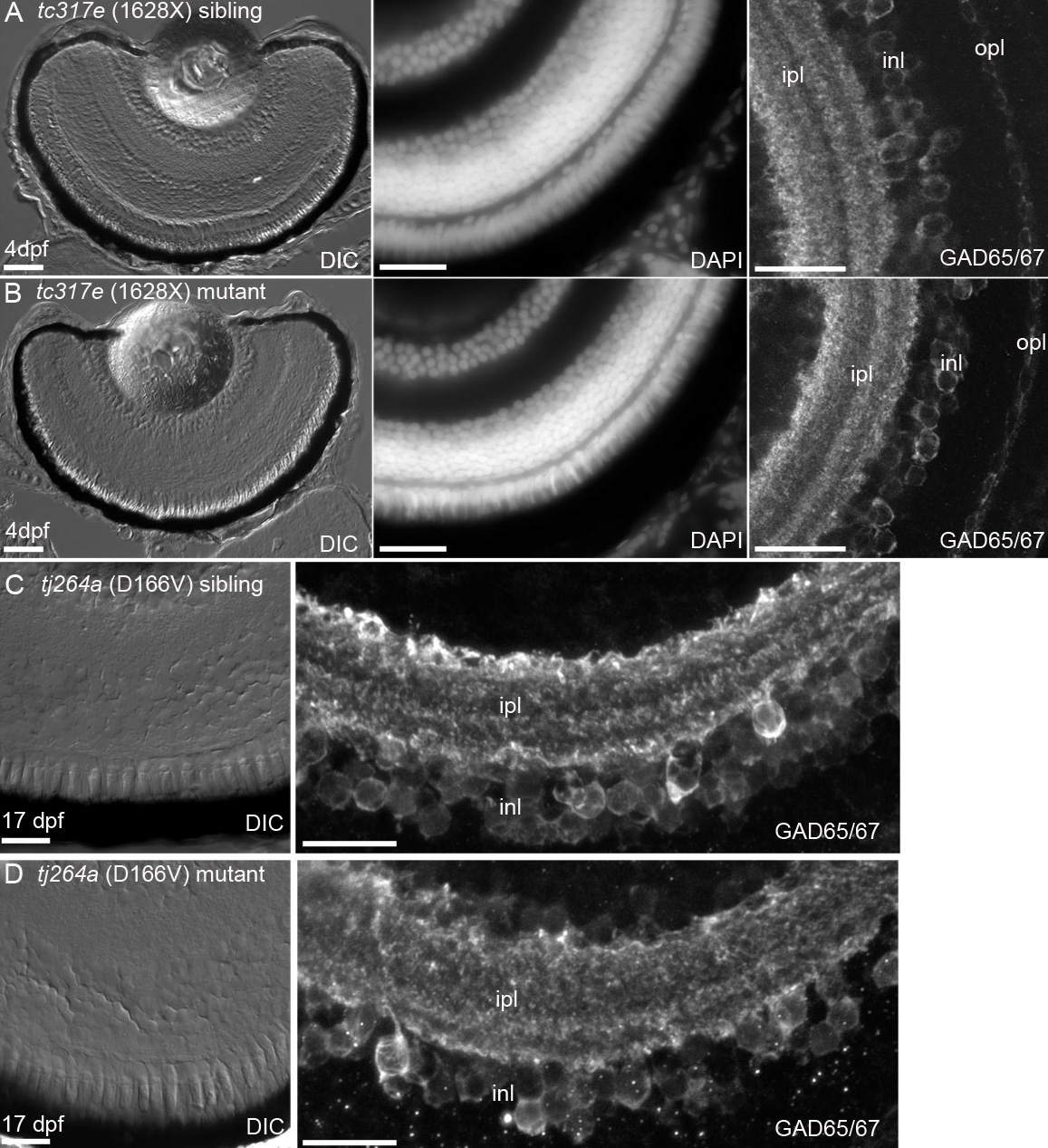 nuclear layer banding pattern with anti-GAD65/67 (right panel) showed that cdh23tc317e siblings (A) and homozygous mutants (B) had morphologically identical retinas. C, D: Siblings and mutants of the cdh23tj264a allele were raised to 17 dpf and their retinas were examined as in A, B. No differences in morphology between siblings and mutants were observed at this later stage of development. Scale bar=50