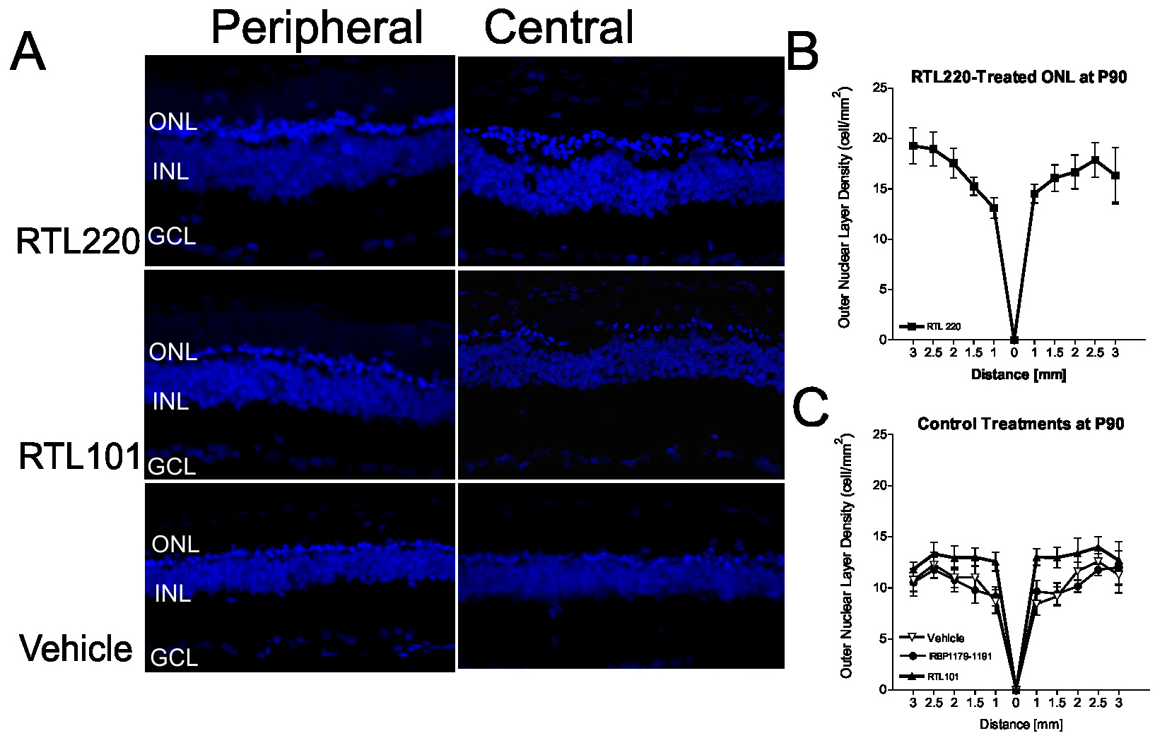 at P90. A: Confocal images of retinas stained with diamidino-phenyl-indole (DAPI) for nuclei at P90 from RTL220-, RTL101-, and vehicle-treated