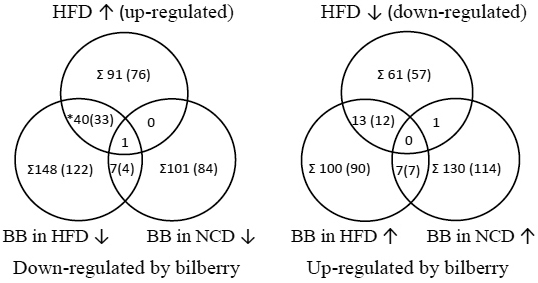 diet (NCD), high-fat diet (HFD) and 5% bilberries (BB) in these diets for 12 weeks. Counts from HFD up- and downregulated