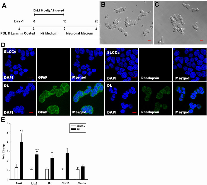 of glial fibrillary acidic protein (GFAP) and Rhodopsin (a photoreceptor marker) whereas SLCCs before differentiation with