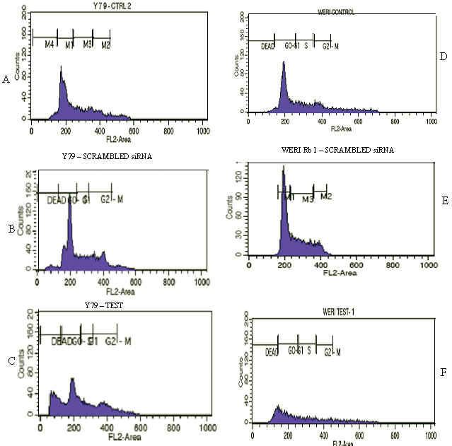 Figure 3. HMGA2 short interfering RNA treatment results in the marked arrest of the cell cycle phase. A: Untreated Y79 cells. B: Scrambled siRNA treated Y79 cells. C: HMGA2 siRNA treated Y79 cells showing marked G:0/G:1 and S: phase cell cycle arrest compared to the control cells. D: Untreated WERI Rb1 cells. E: Scrambled siRNA treated WERI Rb1 cells. F: HMGA2 siRNA-treated WERI Rb1 cells show marked G:2/M phase cell cycle arrest compared to the control cells.