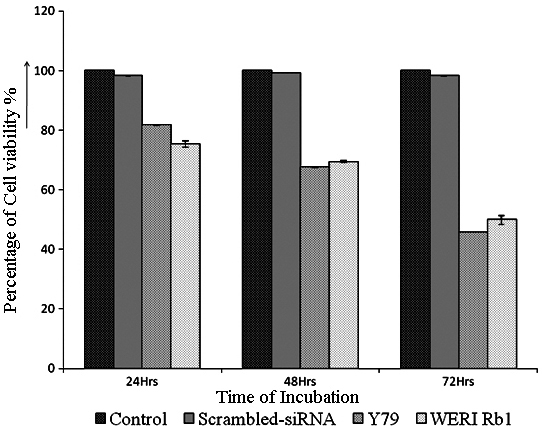 49.9% in the WERI Rb1 cell line when compared to Y79 cells that were not treated with siRNA. The error bars represent the