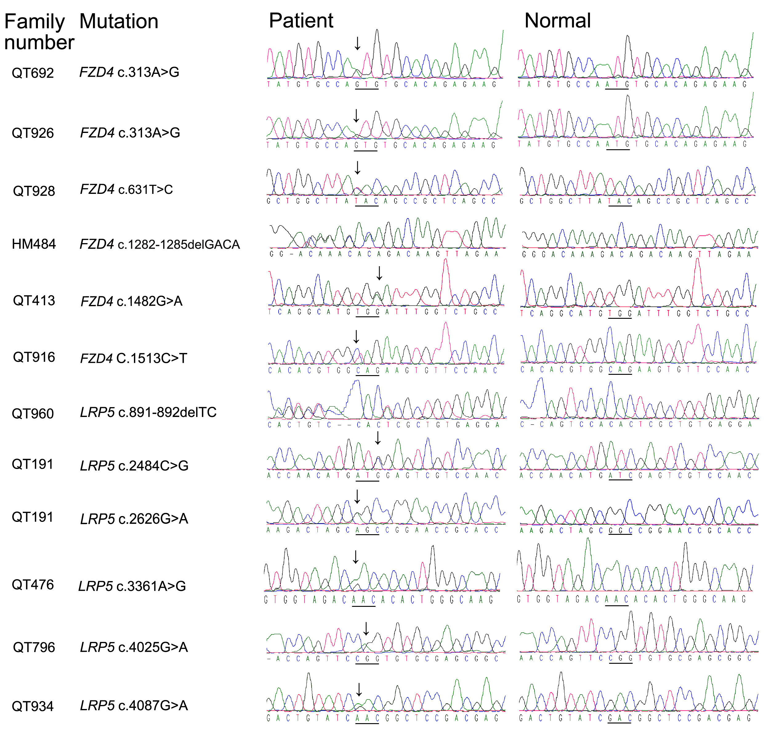 genes of 49 families with FEVR. The columns from left to right display the family number, the mutation designation, and sequence chromatography from patients and normal controls.