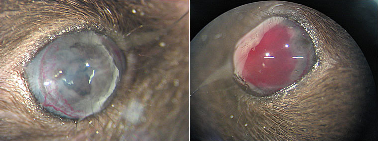 Anterior chamber of murine eyes treated without or with bevacizumab. Anterior chamber hemorrhage as seen in a murine tumor eye treated with bevacizumab (right) in contrast to an untreated eye (left).