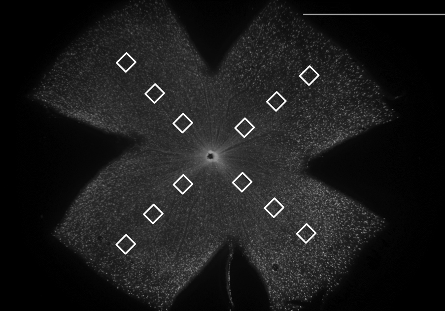 Counted areas in the whole mount retina. Squares of 200×200 µm were counted at 600 μm (central), 1200 μm (middle), and 1800 μm (peripheral) from the optic disc in each of four retinal quadrants. Scale bar indicates 2 mm.