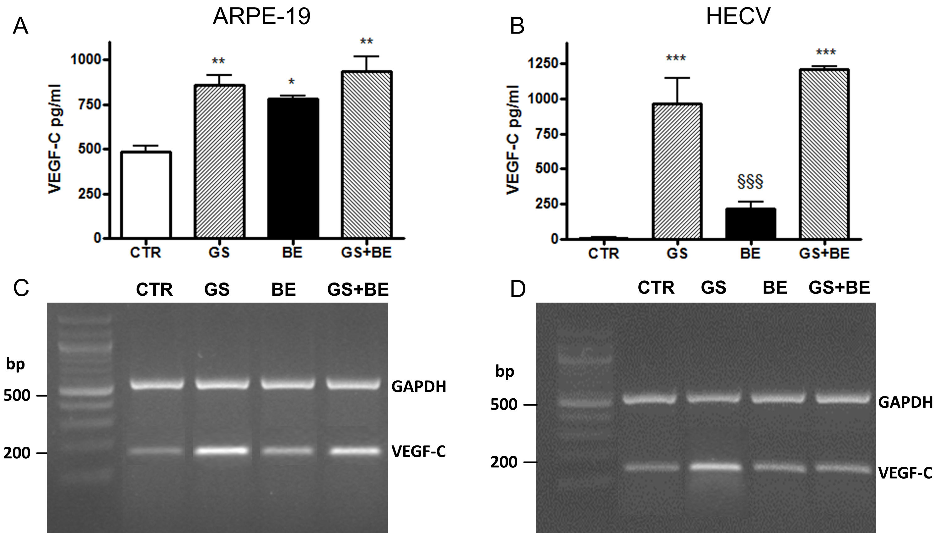 (lower panel) in ARPE-19 (A, C and HECV B,