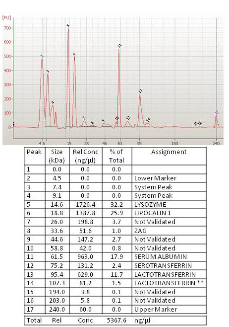 for each peak are shown. **A shoulder peak for lactotransferrin is found in this analysis performed with the Protein 230 kit.