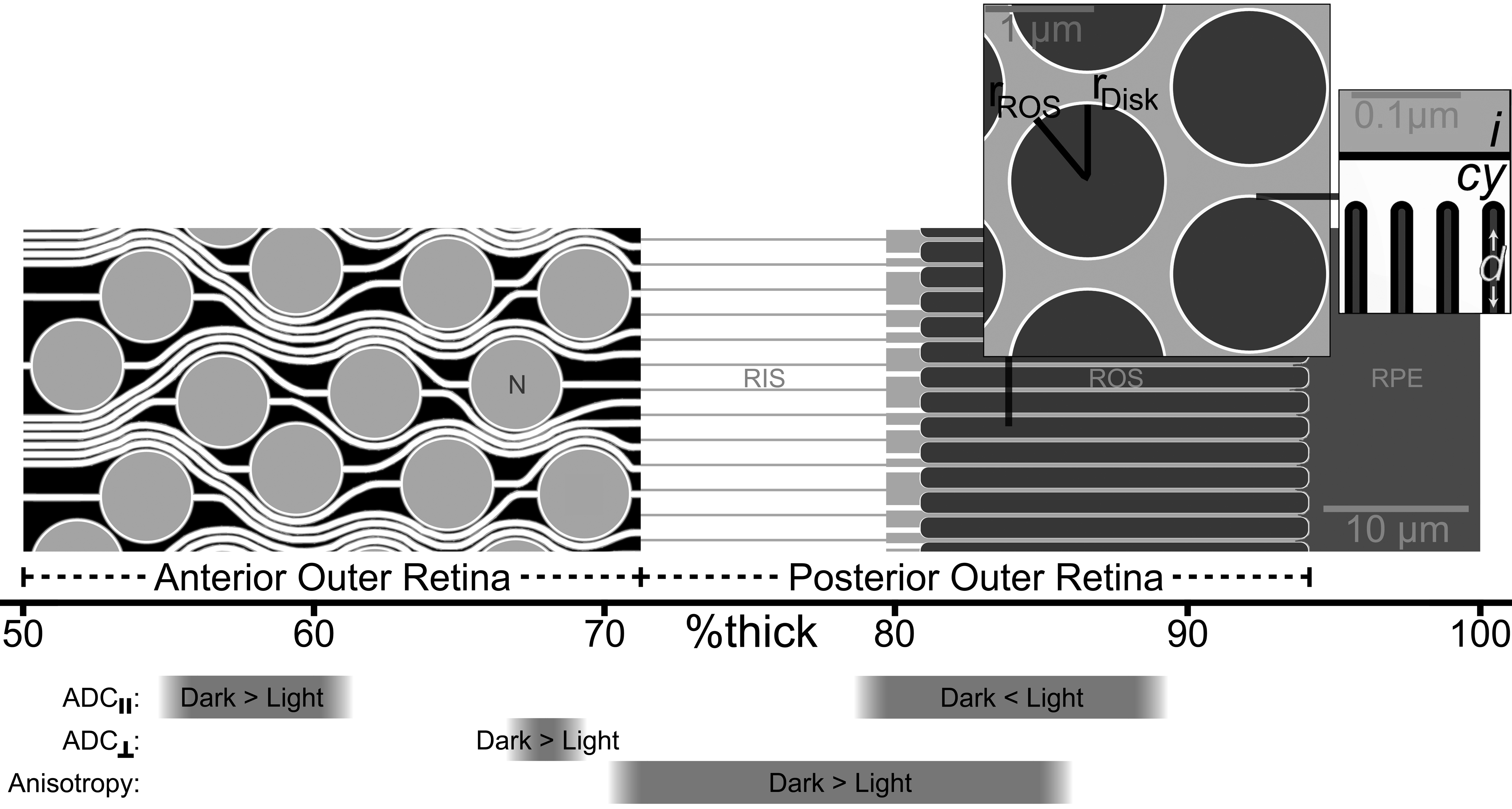 to the optic nerve (ADC┴), and in diffusion anisotropy (i.e., ADC┴ - ADC║). Central retinal rods and associated structures