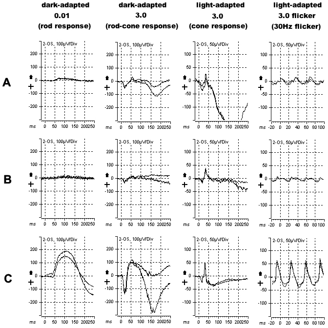 with the diffuse rod-cone photoreceptor degeneration. The four columns represent different categories of electroretinogram