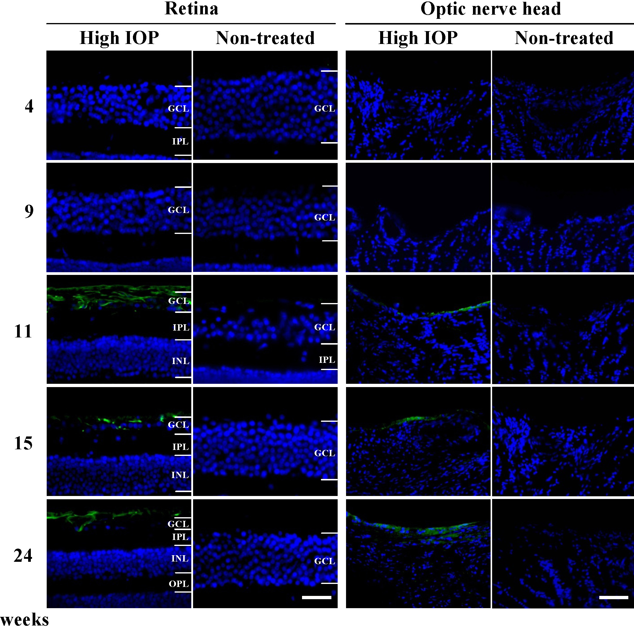 eye elevated at 4 to 24 weeks. Aβ1–42 immunoreactivity was found to be increased in the nerve fiber layer (NFL), the ganglion cell layer (GCL), and ONH of the