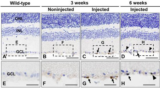 depicted at higher magnification in panels E-H: Arrowheads represent BrdU-positive cells that have incorporated into the ganglion cell layer (GCL), and arrows represent