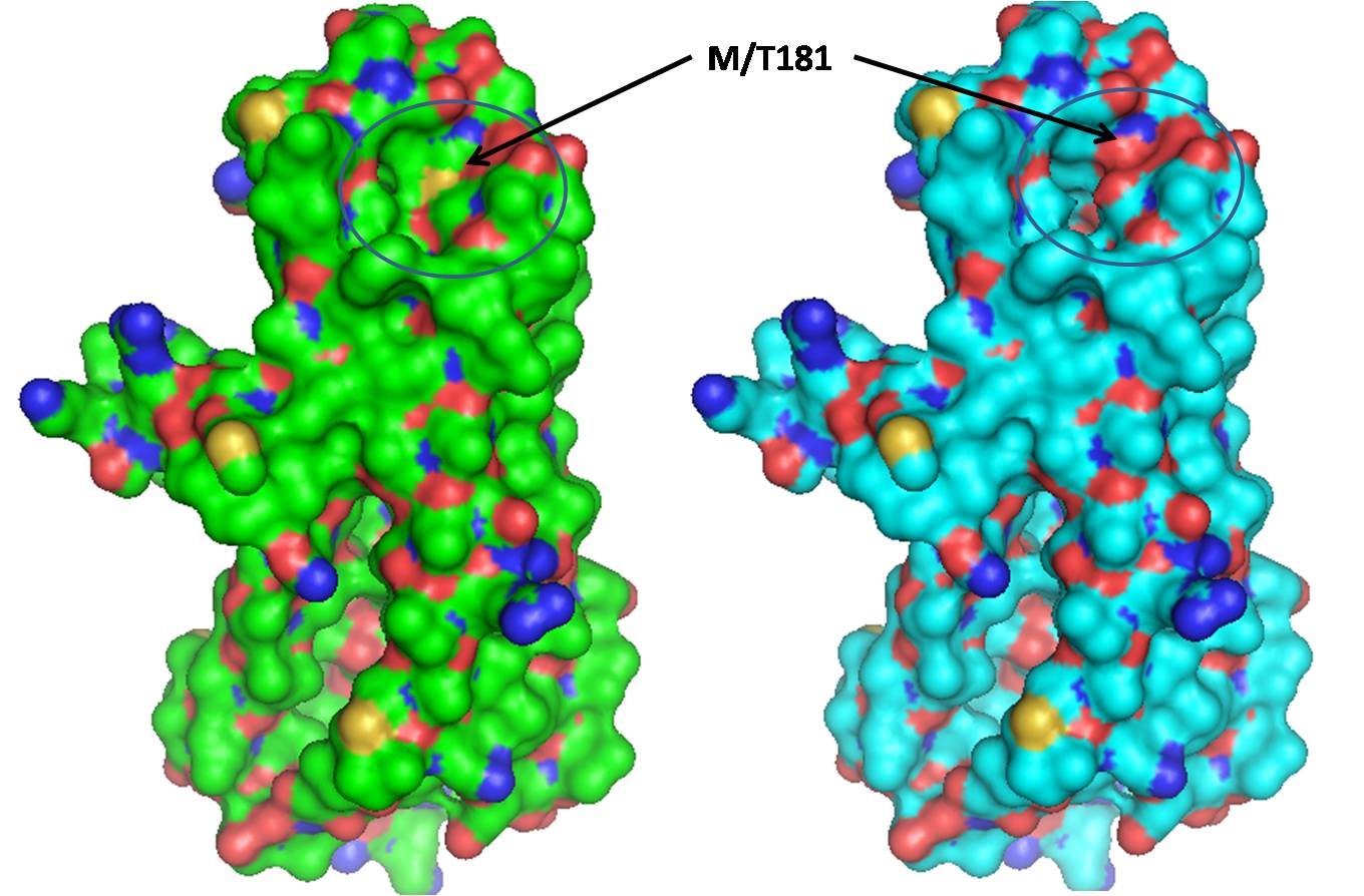 Surface structure of wild-type (green) and mutant (cyan) human mitochondrial ATP synthase subunit a (F-ATPase protein 6) (ATP6). Changes in M181T caused the changes in the surface cavity (shown by circles).