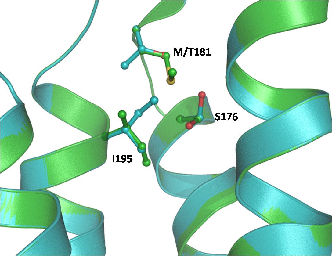 of M181T mutant (cyan). The side chain conformation of Met181, Ser176, and Ile95 (green) in the wild-type and Thr181, Ser176,