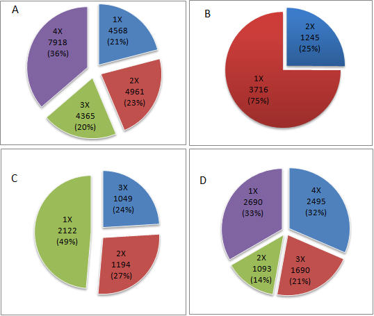 queried at least once). B: Among genes queried 2×, number of genes assessed to be expressed in TM 1× or 2× (% genes queried 2×). C: Among genes queried 3×, number of genes assessed to be expressed in TM 1, 2, or 3× (% genes queried 3×). D: Among genes queried 4×, number of genes assessed to be expressed in TM 1, 2,3, or 4× (% genes queried 4×).