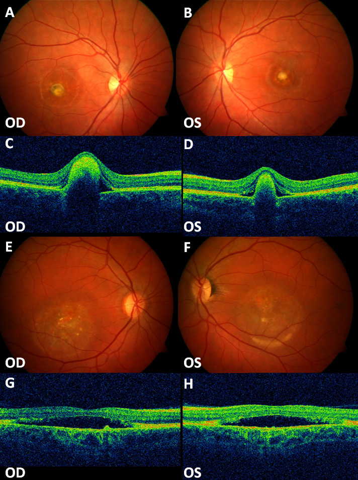 J-III-1). E, F, G, H: Vitelliruptive stage (Patient J-II-2). OD represents the right eye, OS represents the left eye.