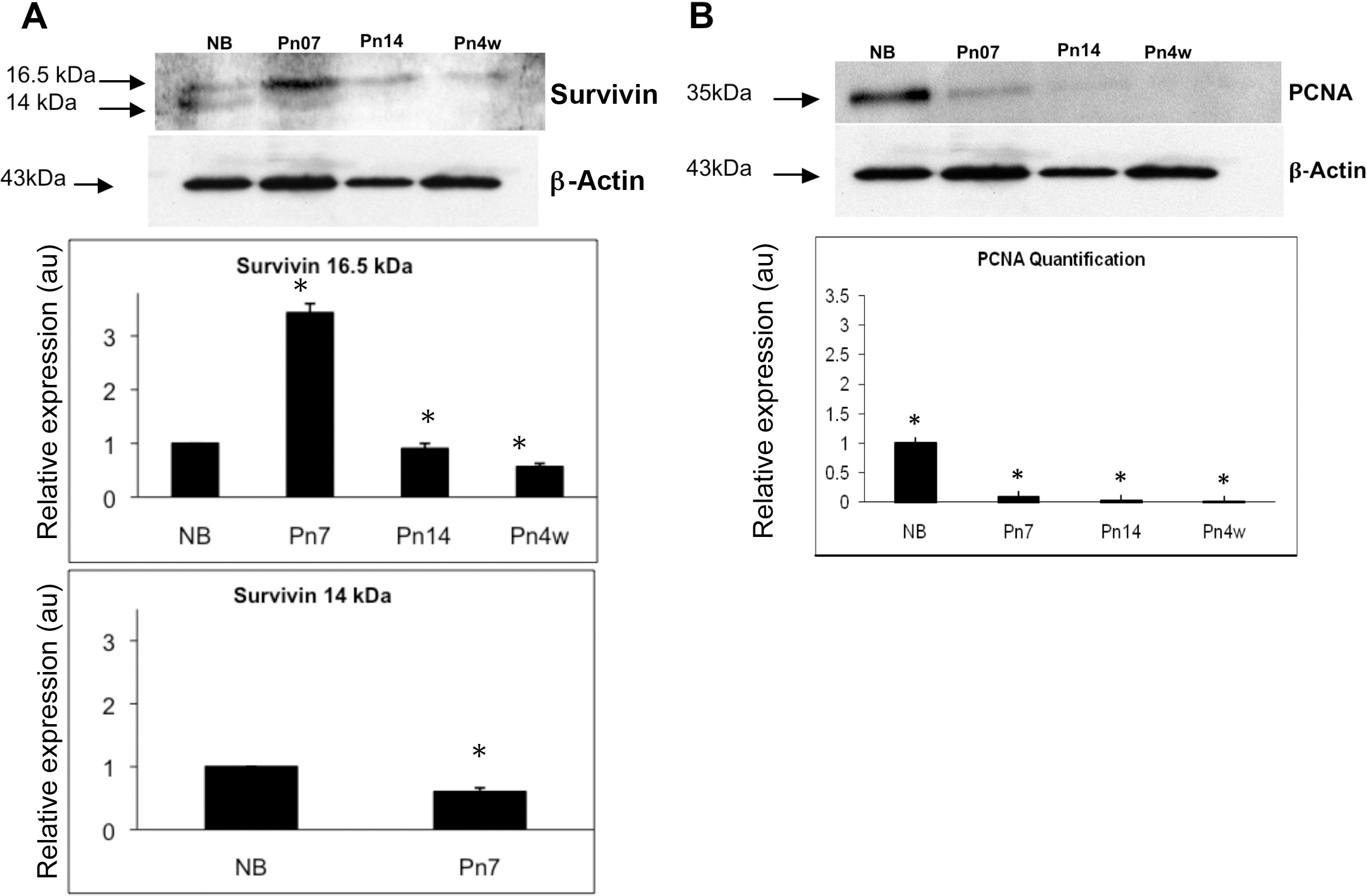 at NB and P7 only. Relative expression levels of Survivin, determined with densitometry and normalized to β-actin protein,