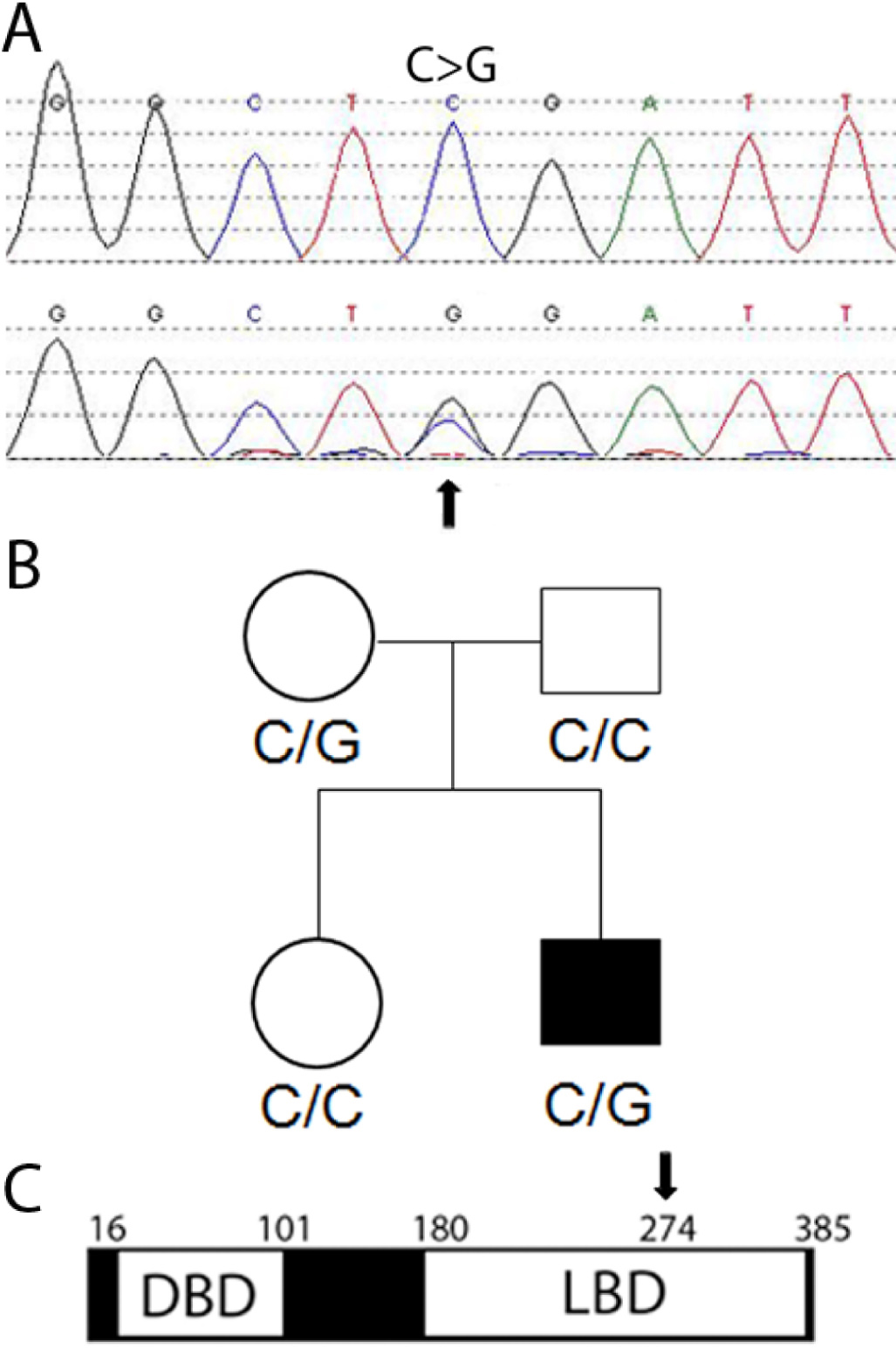 Figure 1. Patient 21,000 and his mother are heterozygous for a novel rare protein variant of NR2E1. A: The patient 21,000 chromatogram shows the base pair change C–>G and the normal allele. B: The pedigree of the family shows the affected boy 21,000. C: NR2E1 amino-acid change from Arg to Gly (arrow) is located in the ligand binding domain. DBD, DNA Binding Domain; LBD, Ligand