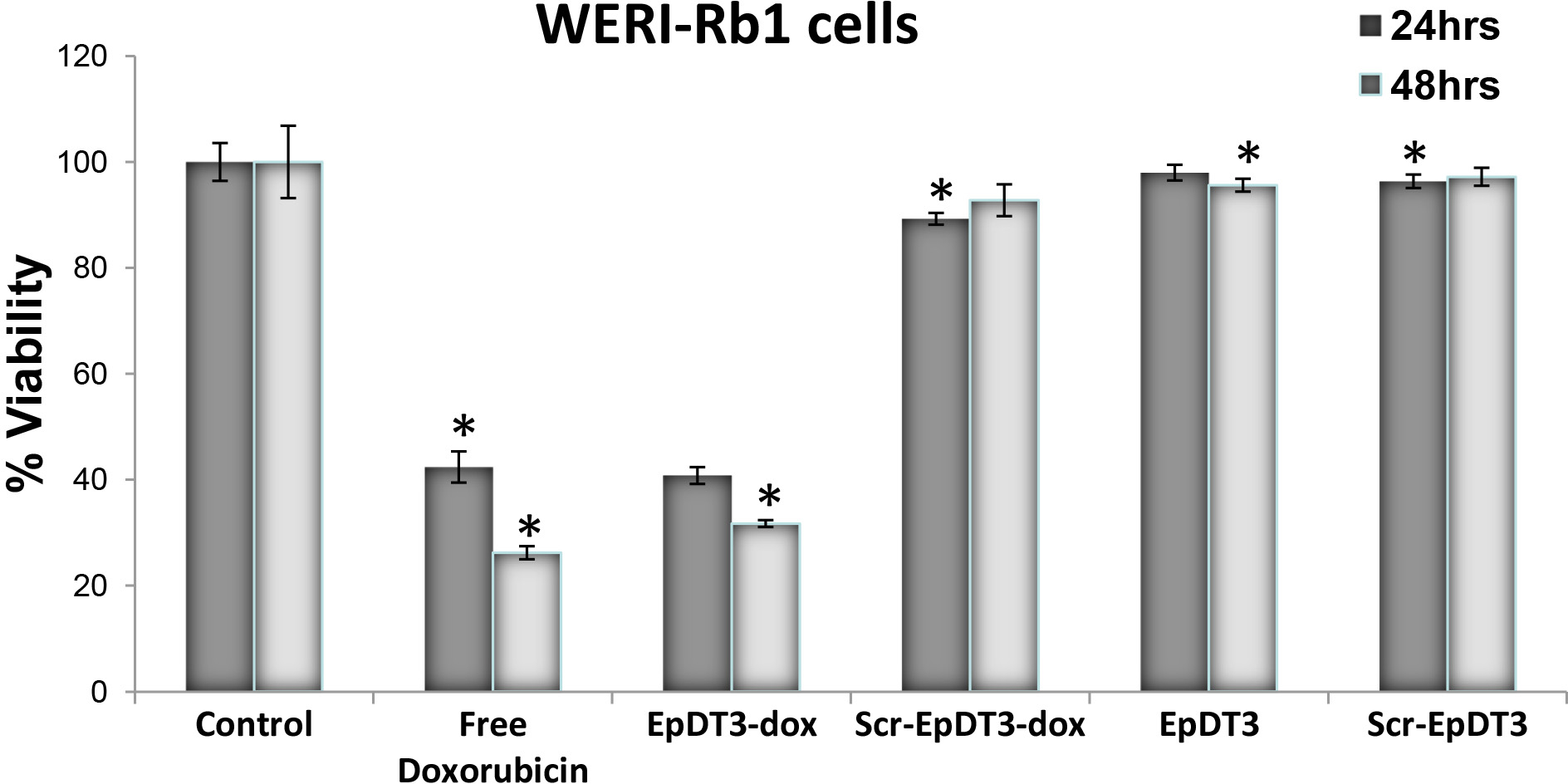 an MTT assay was performed. The graph represents the percent viable WERI-Rb1 cells after 24 h and 48 h of treatment. Cytotoxicity
