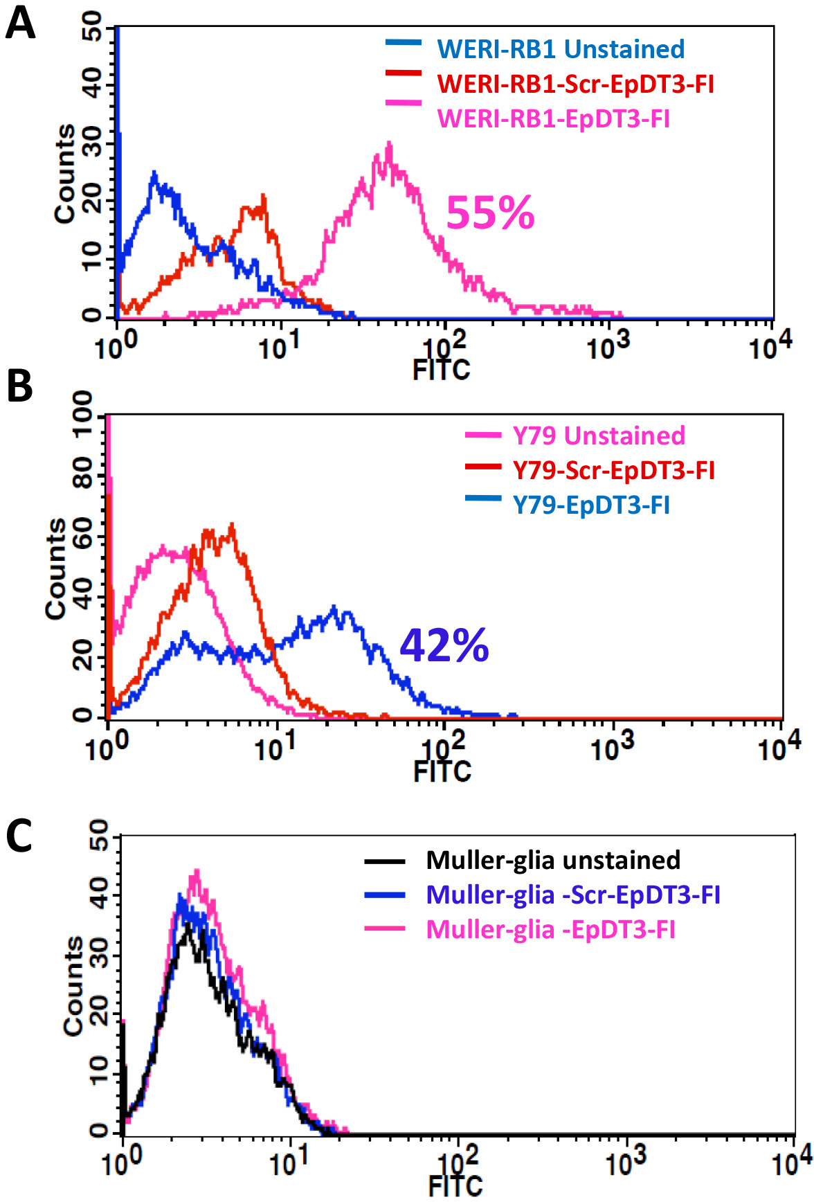 cells and analyzed with flow cytometry. Histogram overlay plot showing distinct population of (A) WERI-Rb1 and (B) Y79 cells bound to EpDT3-FI compared to unstained and Scr-EpDT3-FI bound cells. C: Histogram overlay plot of Müller glial cells showing no distinct population upon incubation with EpDT3-FI or Scr-EpDT3-FI