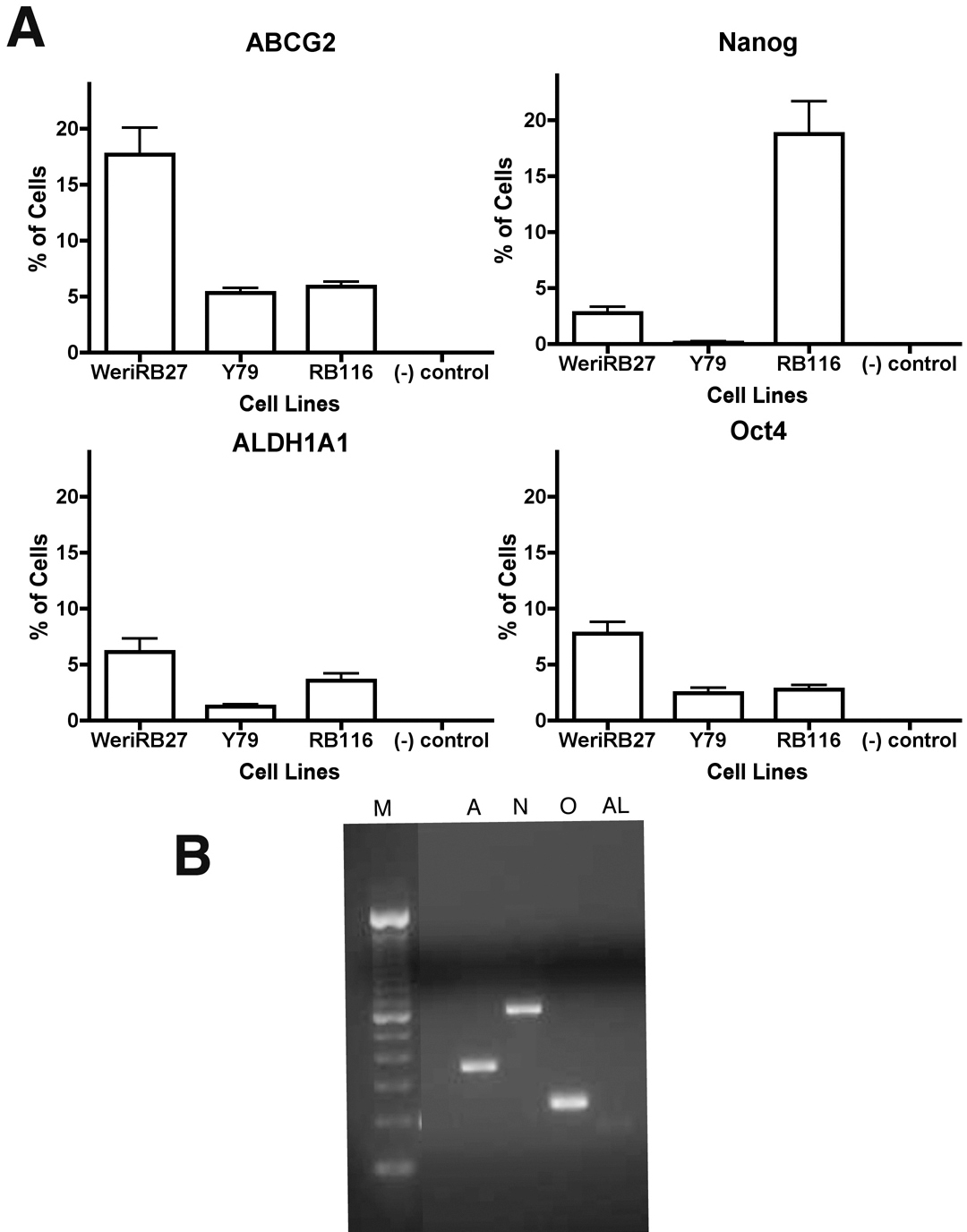 control (p<0.001) and RB116 is greater than (-) control (p<0.05). B: RB116 cells were analyzed by reverse transcriptase polymerase chain reaction (RT–PCR) and found to express ABCG2, Nanog, Oct3/4, and ALDH1A1. The lanes of the gel are indicated as follows: M=marker, A=ABCG2, n=Nanog, O=Oct3/4, AL=ALDH1A1.