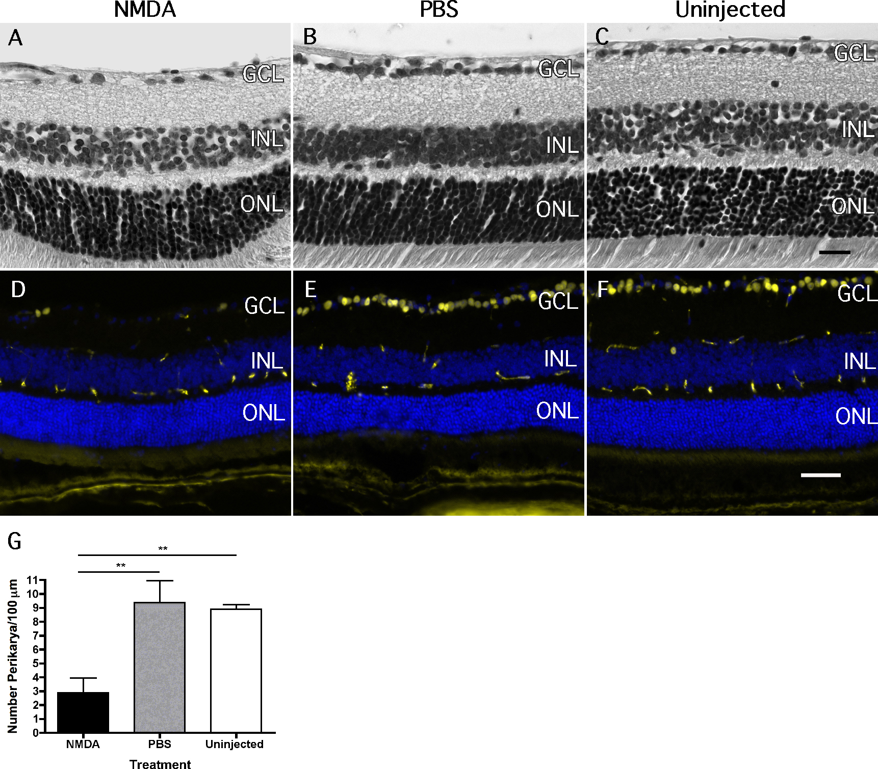 in the outer plexiform layer (OPL), inner nuclear layer (INL), and inner plexiform layer (IPL). G: Cell bodies in the ganglion cell layer (GCL) were quantified at 6 days after intravitreal injection of NMDA (black bar)
