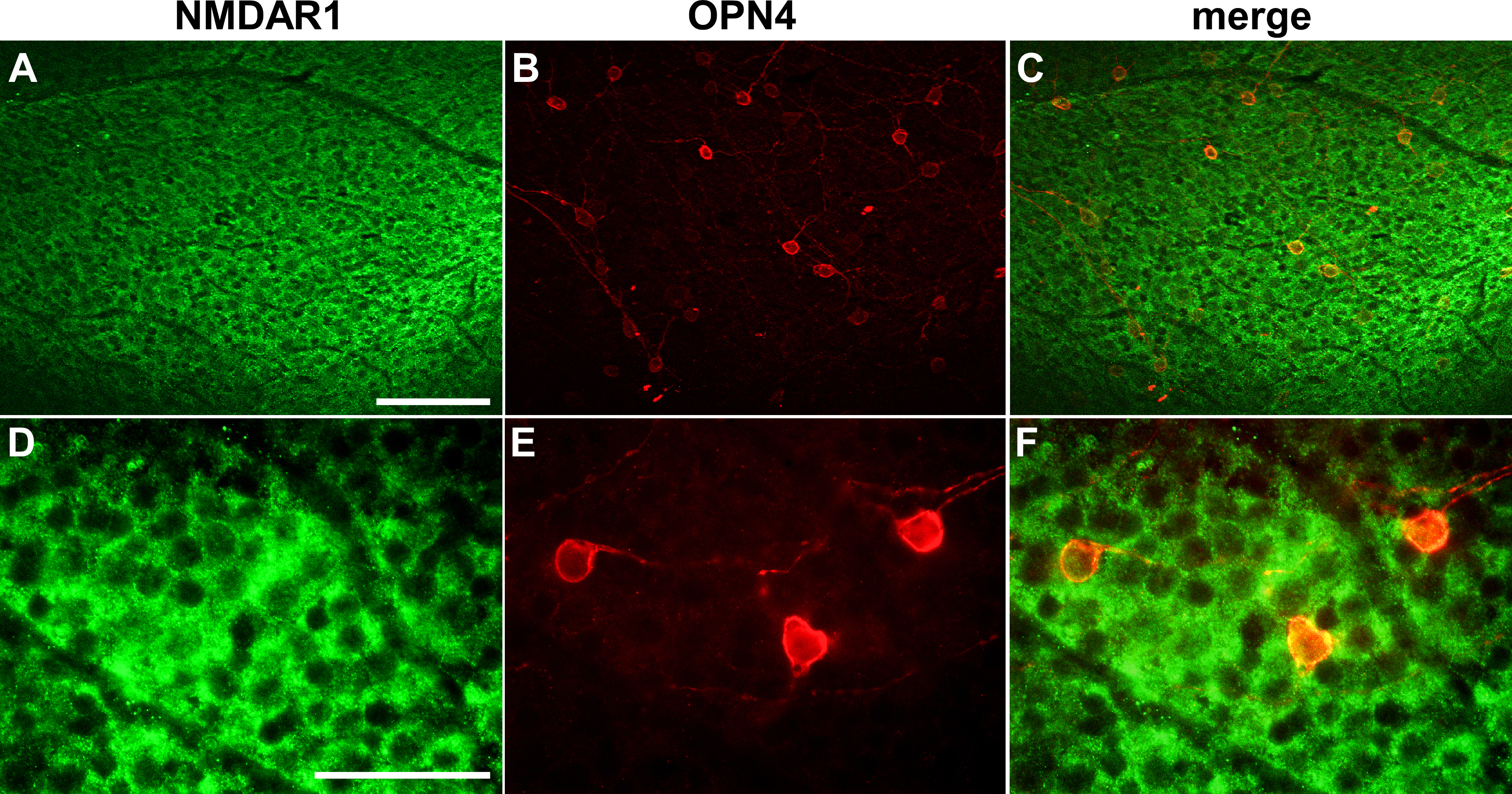 mounts of untreated wild type mice stained for A, D: NMDAR1 (green) and B, E: OPN4 (red) at A-C: lower and D-F: higher magnification. C, F: Images shown in panels A and B, and in panels D and E, respectively, are merged. Focal plane was at the ganglion cell layer. Scale bars are A-C: 100 µm and D-F: 50 µm.