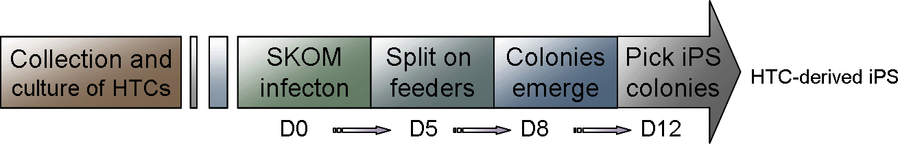 Schematic representation of induced pluripotent stem cell (iPSC) generation from human Tenon’s capsule fibroblasts (HTFs). SKOM refers to the four exogenous factors, Sox2, Klf4, Oct3/4, and c-Myc.