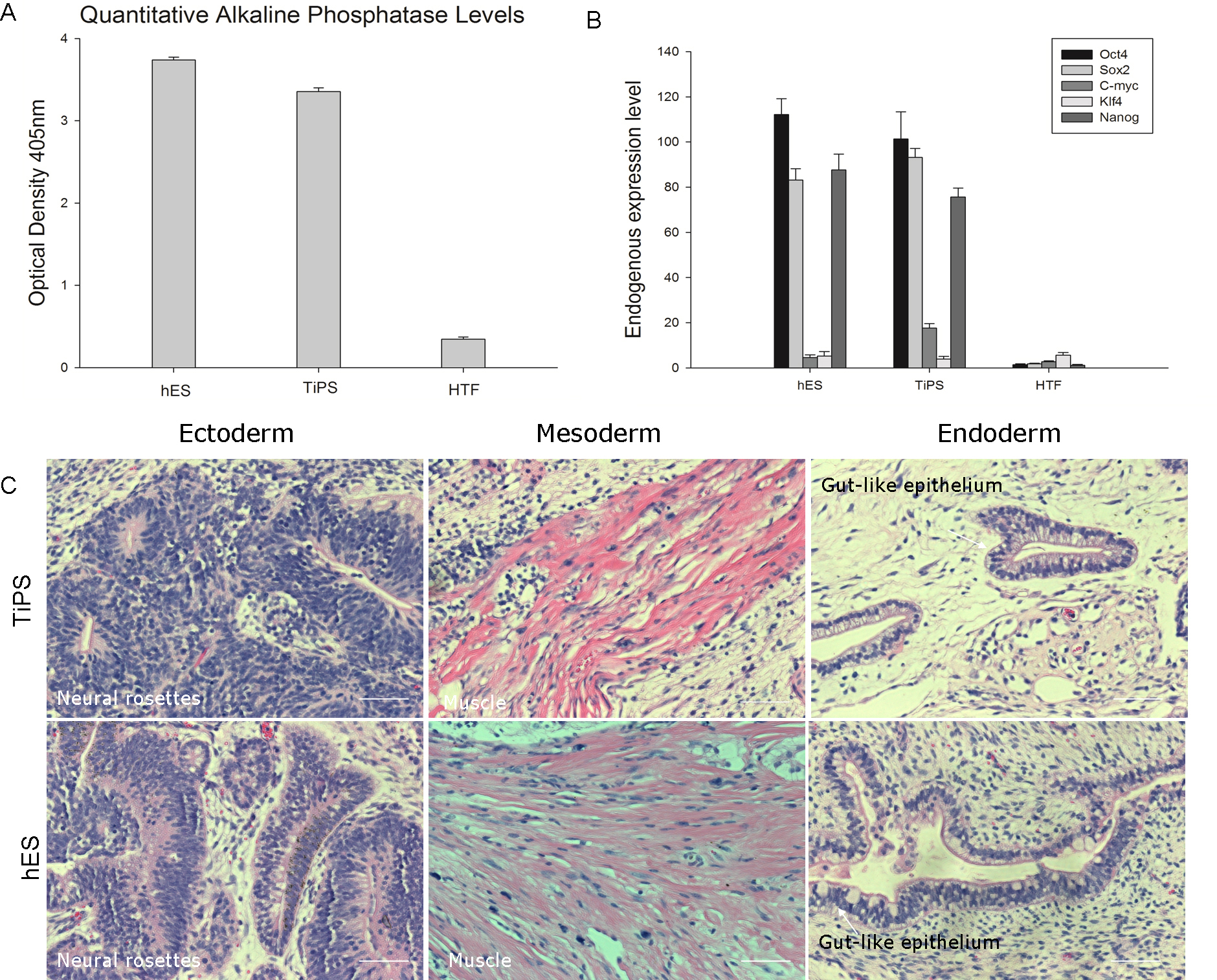 the mean±SD (n=3). C: Teratoma derived from TiPS and hESC. Hematoxylin and eosin staining of the TiPS-derived teratoma, showing derivatives of