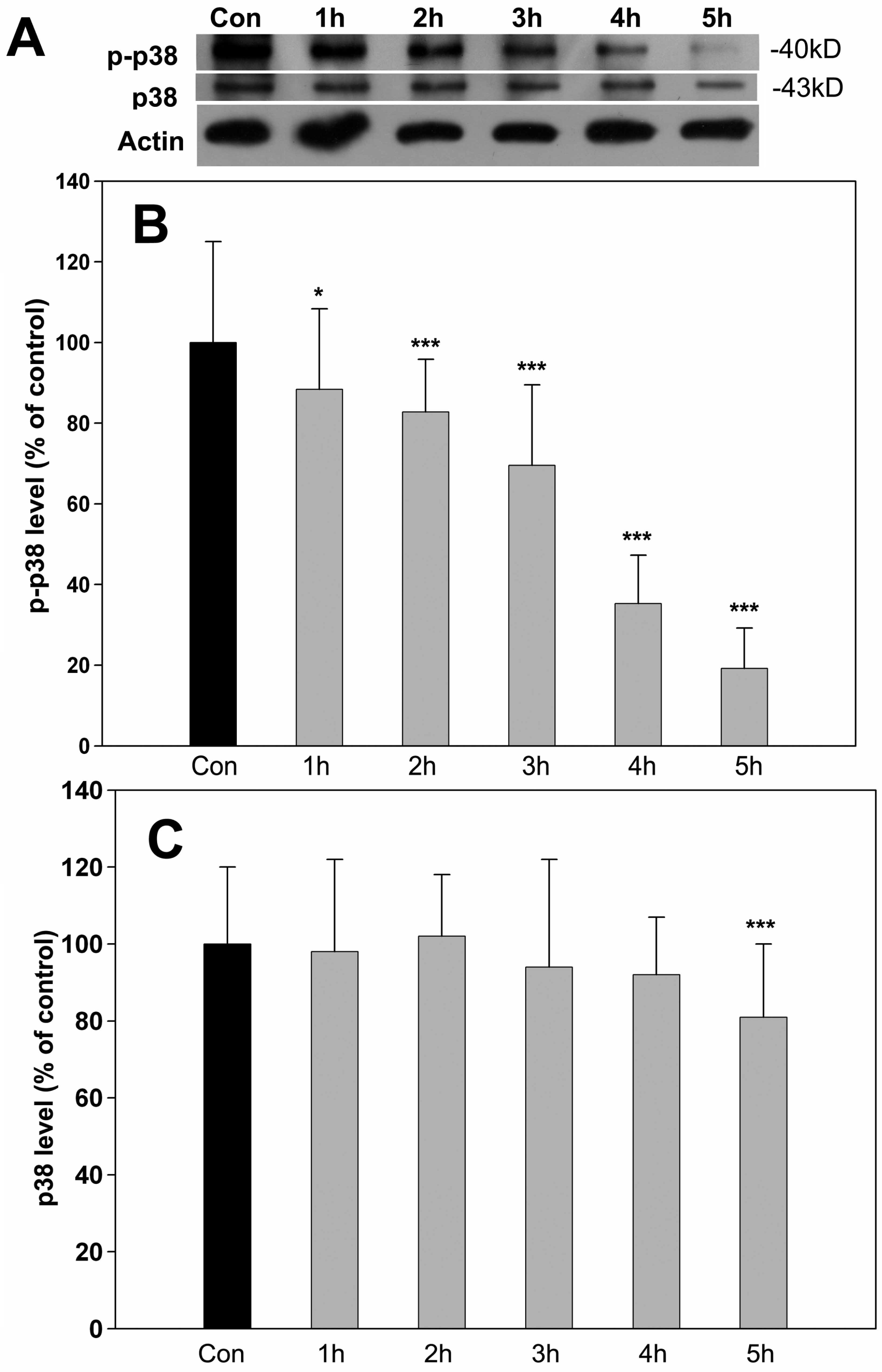 experiments and expressed as the mean±SEM ***p<0.001, compared with controls. C: Total p38 levels were quantitated and statistically analyzed. Data were obtained from at least three independent experiments