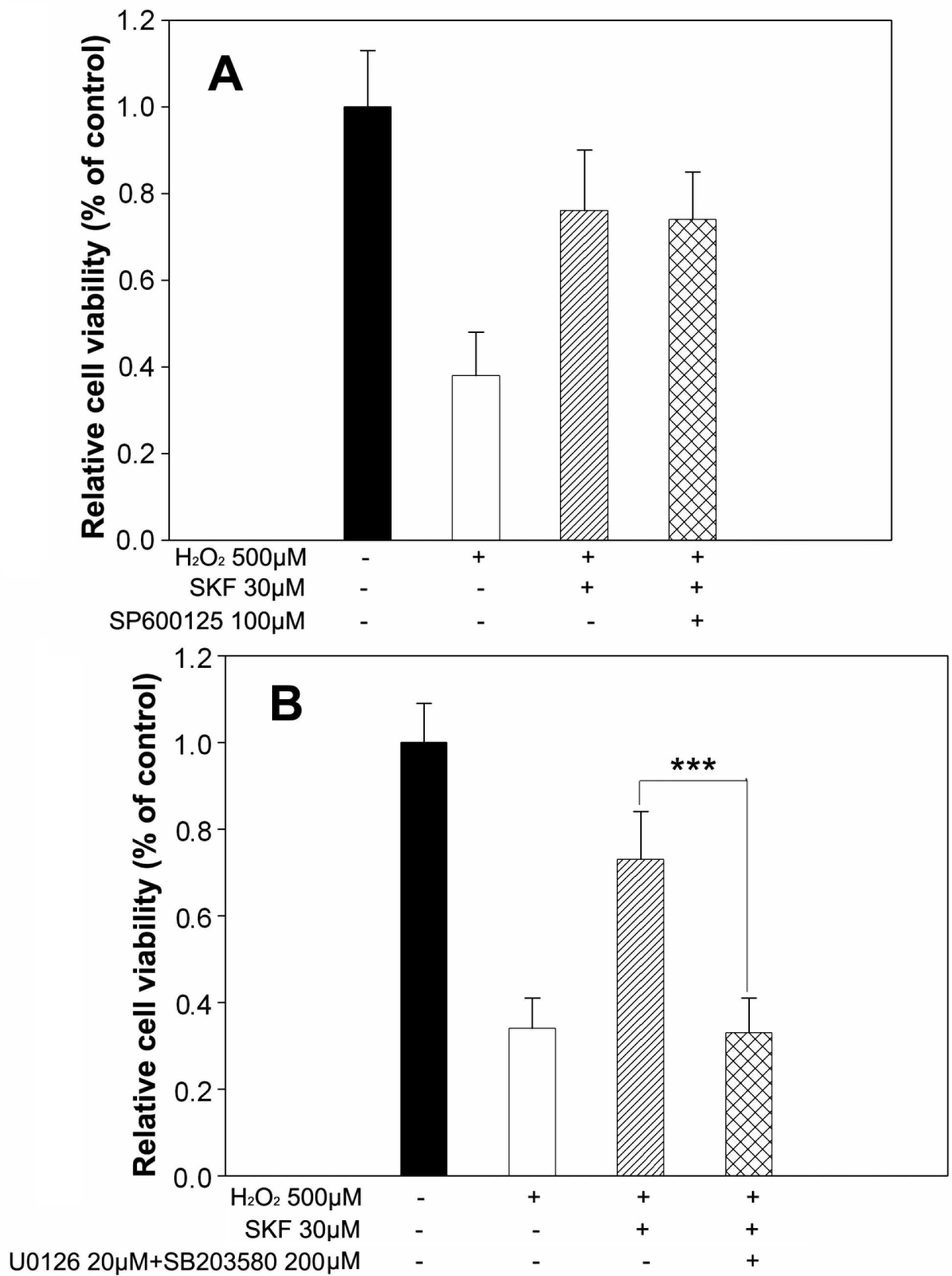 with 20 μM U0126 and 200 μM SB203580 30 min before 30 μM SKF83959 was added in the presence of 500 μM H2O2 for 5 h. Cell viability was determined with MTT assay. Data were obtained from at least three independent experiments and
