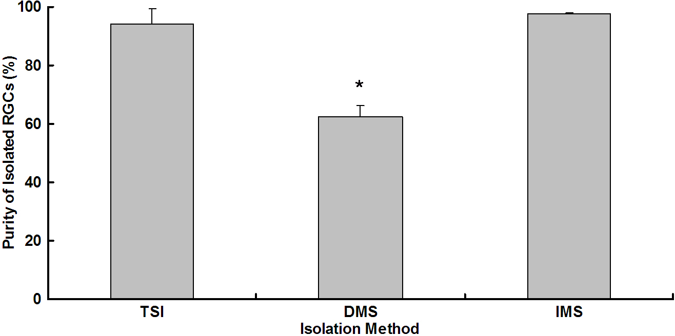 Purity of isolated retinal ganglion cells for three different methods, including two-step immunopanning, direct magnetic separation, and immunopanning-magnetic separation. Data were expressed as the mean±SEM (n=9 for each method).*p=0.023.