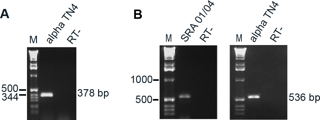left. M indicates DNA marker and RT- indicates without reverse transcriptase control.