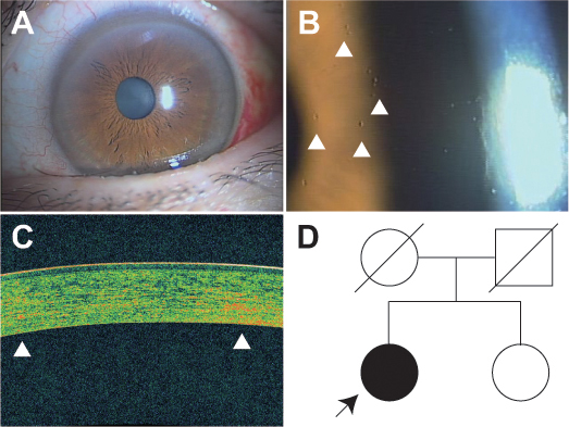 Figure 1. Images demonstrating the corneal phenotypes of a patient with fleck corneal dystrophy. A: Stromal flecks are not perceptible under diffuse illumination in both of the patient’s eyes. B: Under iris retroillumination, stromal flecks (arrowheads) became evident. C: Optical coherence tomography analysis successfully detected the stromal flecks as slightly bright small areas (arrowhead).