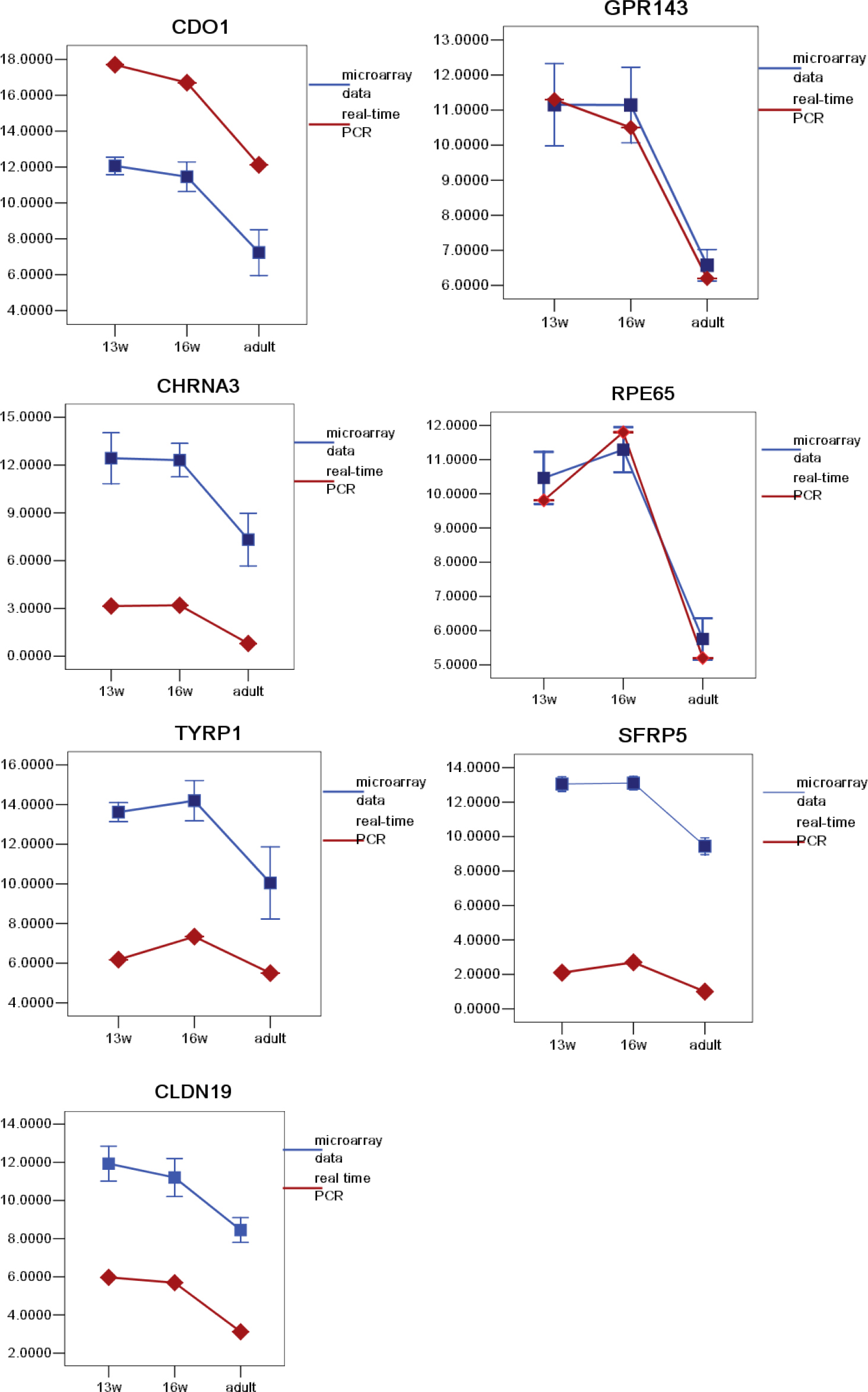 Figure 10. Validation of the microarray gene expression profiles. The expression profiles of CDO1, GPR143, CHRNA3, RPE65, TYRP1, SFRP5, and CLDN19 were validated by comparing the microarray data with the gene expression data from real-time RT–PCR. Various profiles were