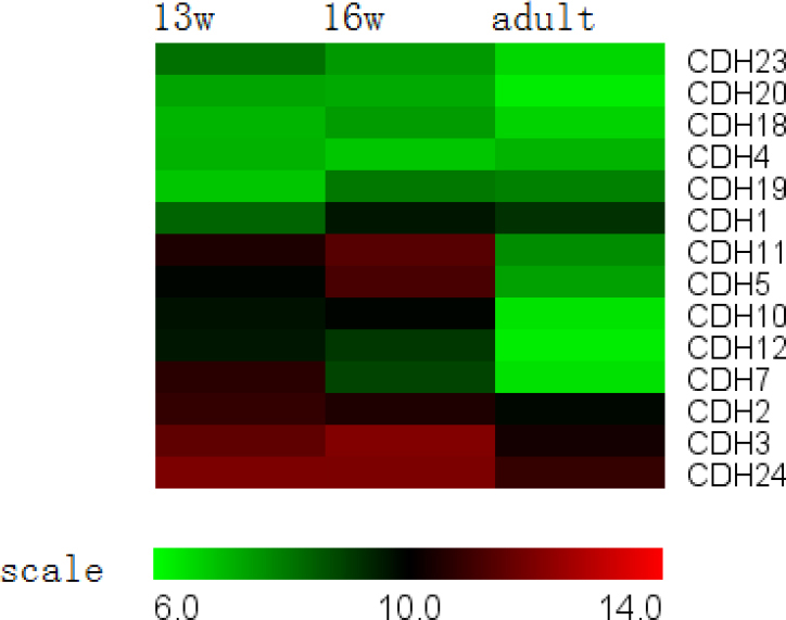 was significantly downregulated throughout development, while other cadherin family members exhibited