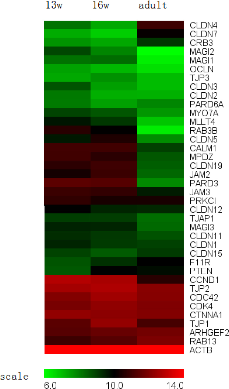 proteins were stably expressed during development, such as F11R, JAM2, CRB3, and occludin. Claudin-1, 2, 3, 5, and 19 presented a trend of downregulation during development, and claudin-4 and 7 presented an upregulation trend during development. JAM-C expression decreased during development. Genes coding for adaptor proteins, such as ZO-1, ZO-2, ZO-3, TJAP1, MPDZ, MAGI1, MAGI3, ACTB, and CTNNA1 (α-catenin), were stably expressed during development. The expression of MAGI2, PARD3, and MLLT4 was significantly downregulated between 13-week-old fetuses and adults. Among the effector proteins analyzed, the expression