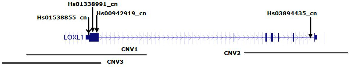 LOXL1 gene. The actual copy number assay ID was included in the figure. Three assays (Hs01538855_cn, Hs01338991_cn, and Hs00942919_cn)