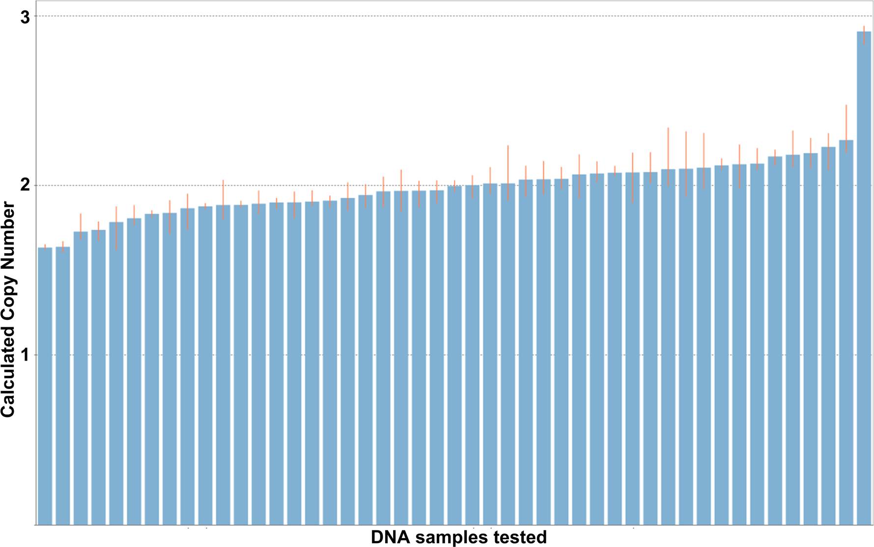 Figure 3. DNA copy number variations with DNA samples tested using Hs01538855_cn copy number assay from Applied Biosystems. Each DNA