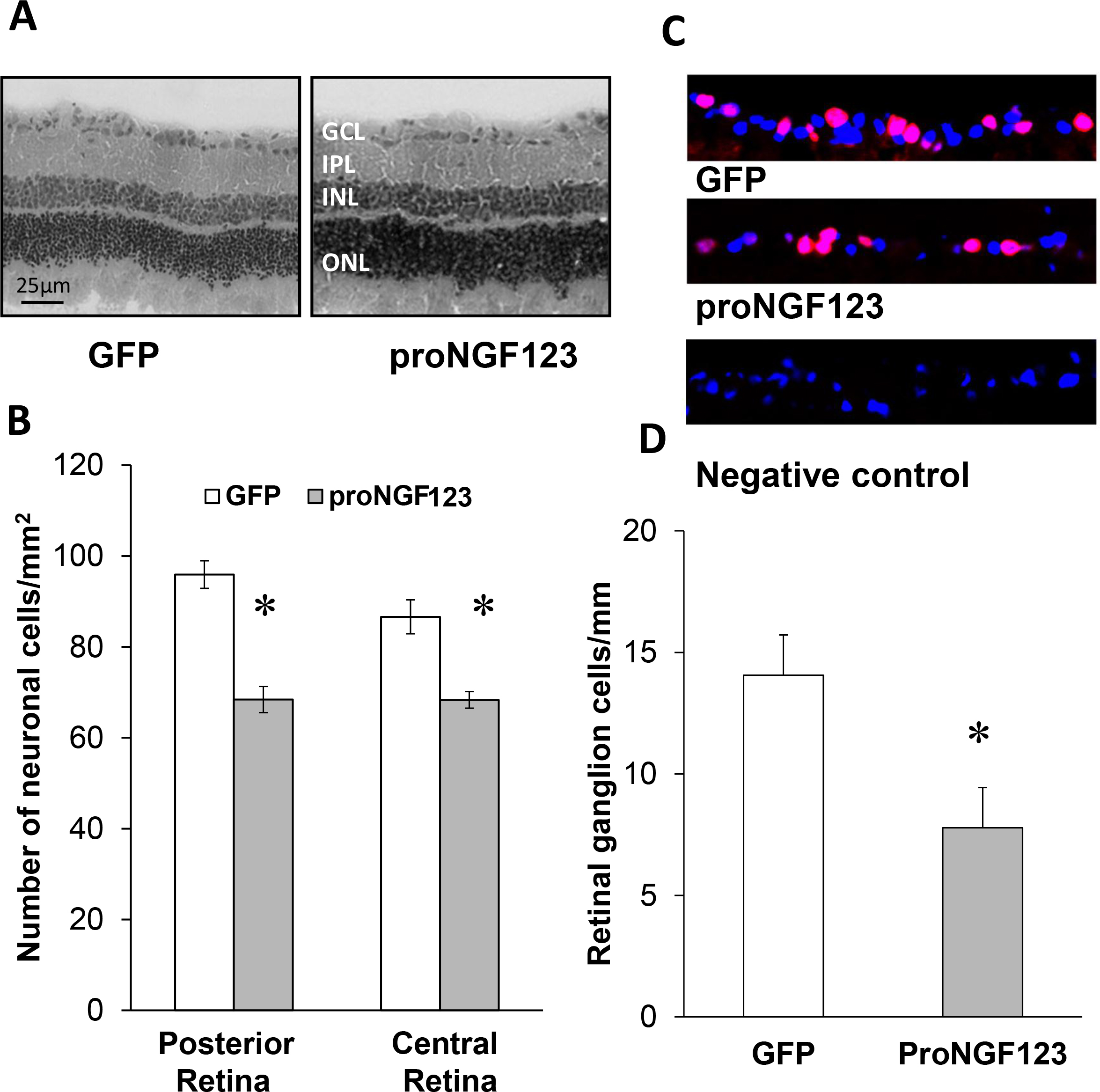 in number of neuronal cells in the ganglion cell layer in rats injected with p-GFP-proNGF123 as compared with pGFP controls