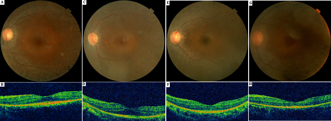 Figure 3. Fundus photographs(top panel) and optical coherence tomography images (lower panel) of four probands with mutations in the