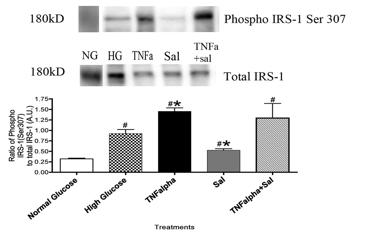 Figure 1. Ratio of insulin receptor substrate (IRS)-1Ser 307 in Müller cells. A phosphorylation of IRS-1Ser307 is significantly increased in Müller cells following treatment with tumor necrosis factor–α, but treatment with beta-2-adrenergic