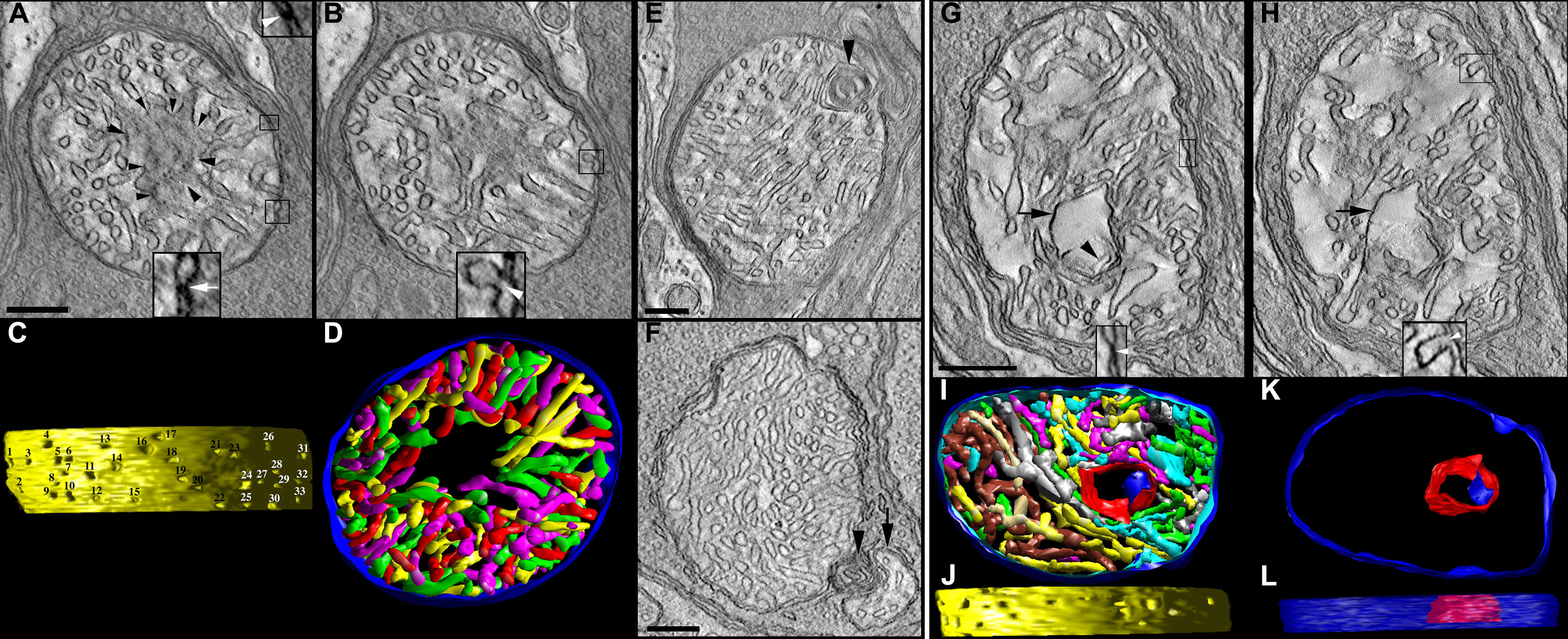 I: The top view of the segmented volume shows the outer membrane and the entire complement of 69 cristae (various colors).