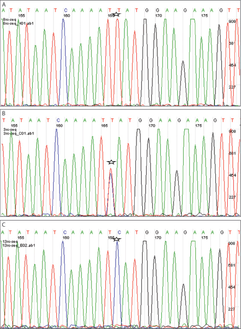 Figure 3. Shown here are samples of CFH sequencing results from three representative retinal DNA samples. Position 166 indicates the location of the CFH Y402H single nucleotide polymorphism (SNP). A: The SNP position (166 bp) indicated with a star exhibited a wild-type TT allele. B: The SNP position (16 6bp) indicated with a star exhibited a heterozygous TC allele. C: The SNP position (166bp) indicated with a star exhibited a homozygous CC allele. These sample results showed that the proposed
