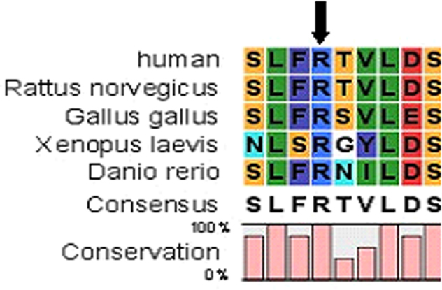 from different species. The alignment data indicates that the Arg at the 54th amino acid position is highly conserved among many species (indicated by an arrow).